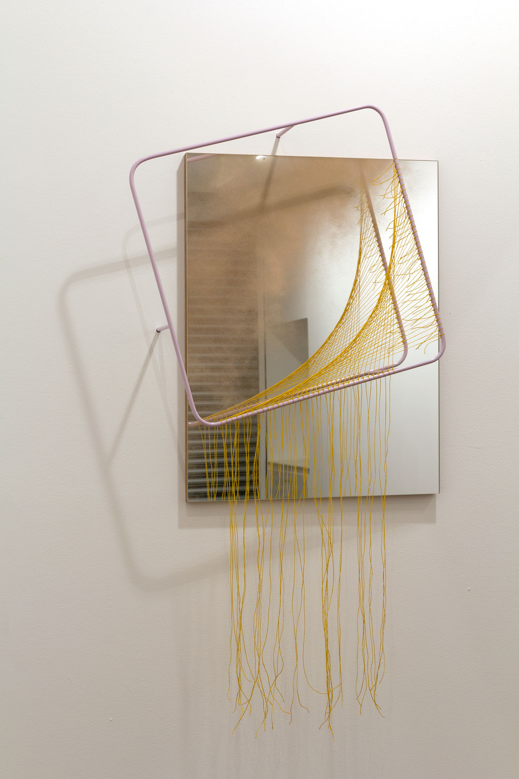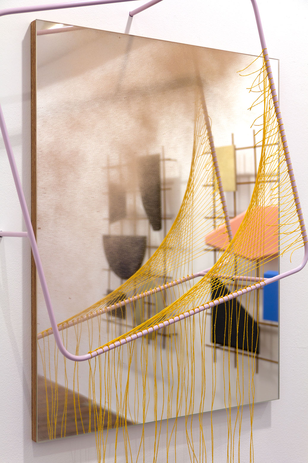 Plywood, mirror, powder-coated mild steel, linen thread, fabric dye, spray-paint.