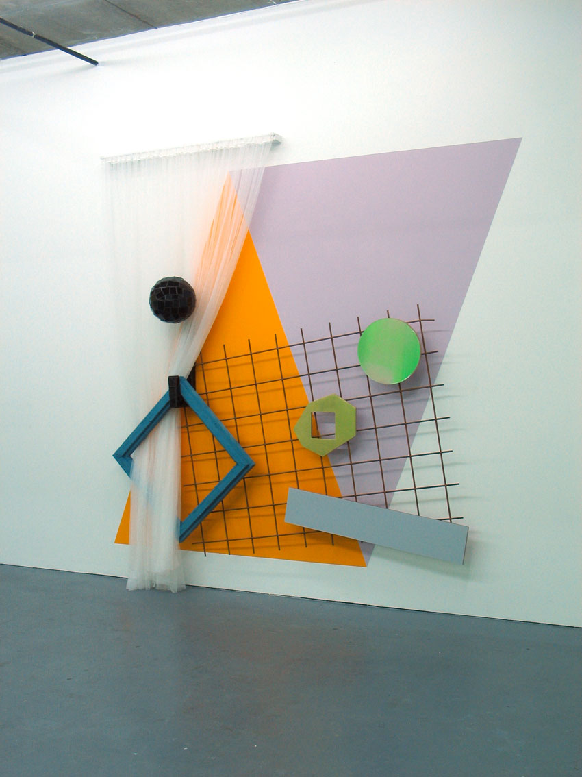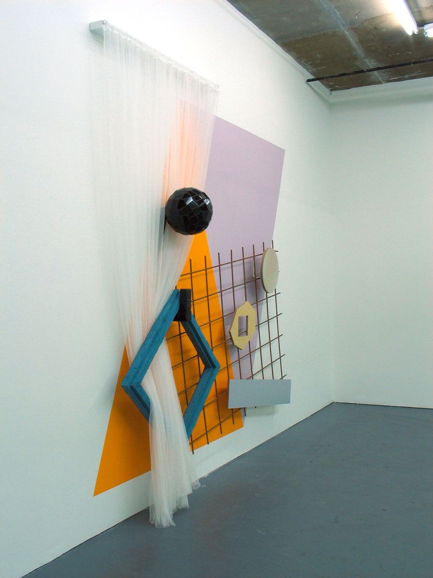 Tulle curtain, wood, polystyrene, Jesmonite, ceramic tiles, coloured grout, emulsion paint,