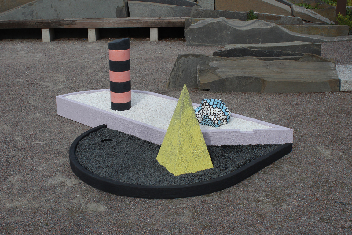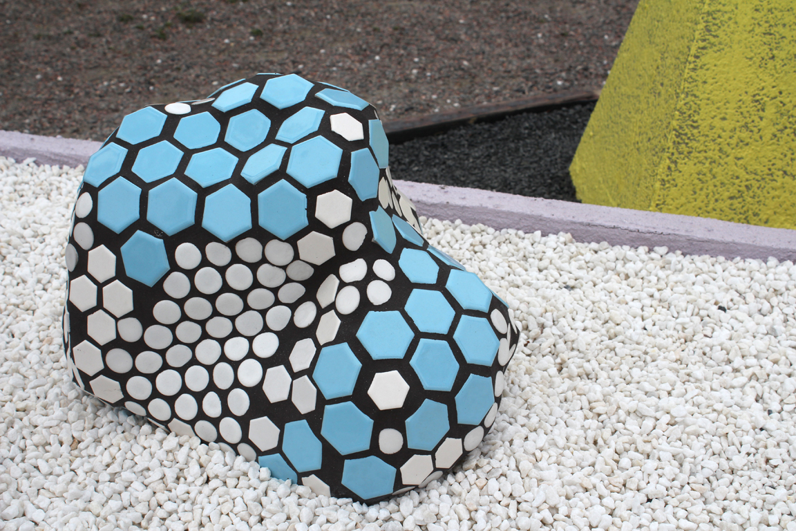 Plywood, flexible plywood, pigmented concrete, MDF, cement, gloss paint, expanded polystyrene, quadraxial fibreglass, pigmented Jesmonite, wire mesh, Jesmonite, ceramic mosaic tiles, coloured grout.