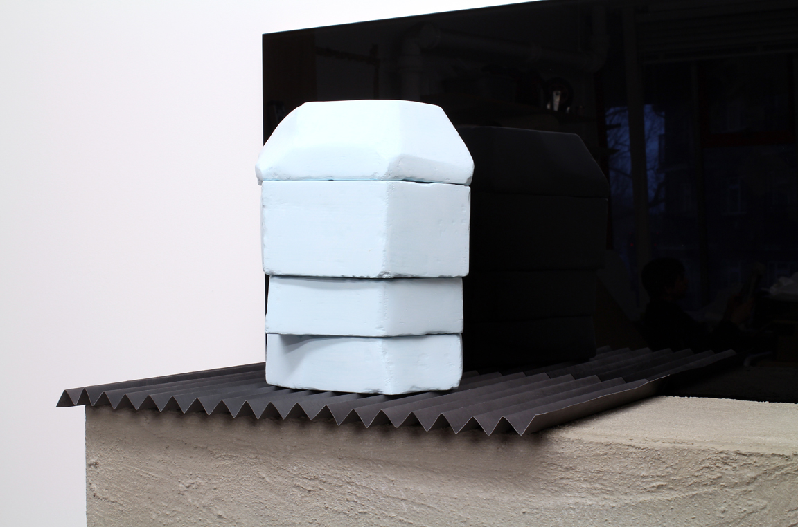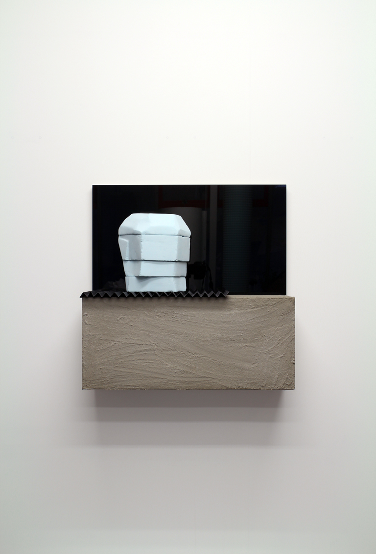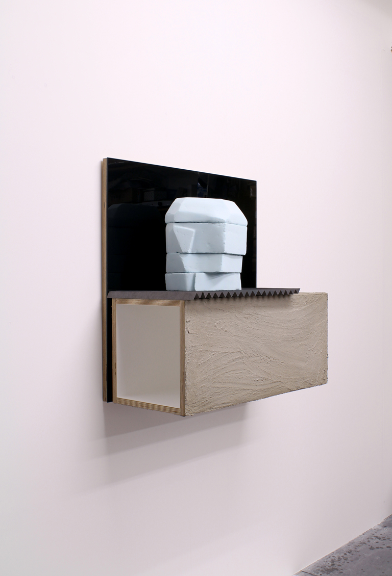 Black mirror, concrete, pigmented jesmonite, paper, graphite, paint, plywood.