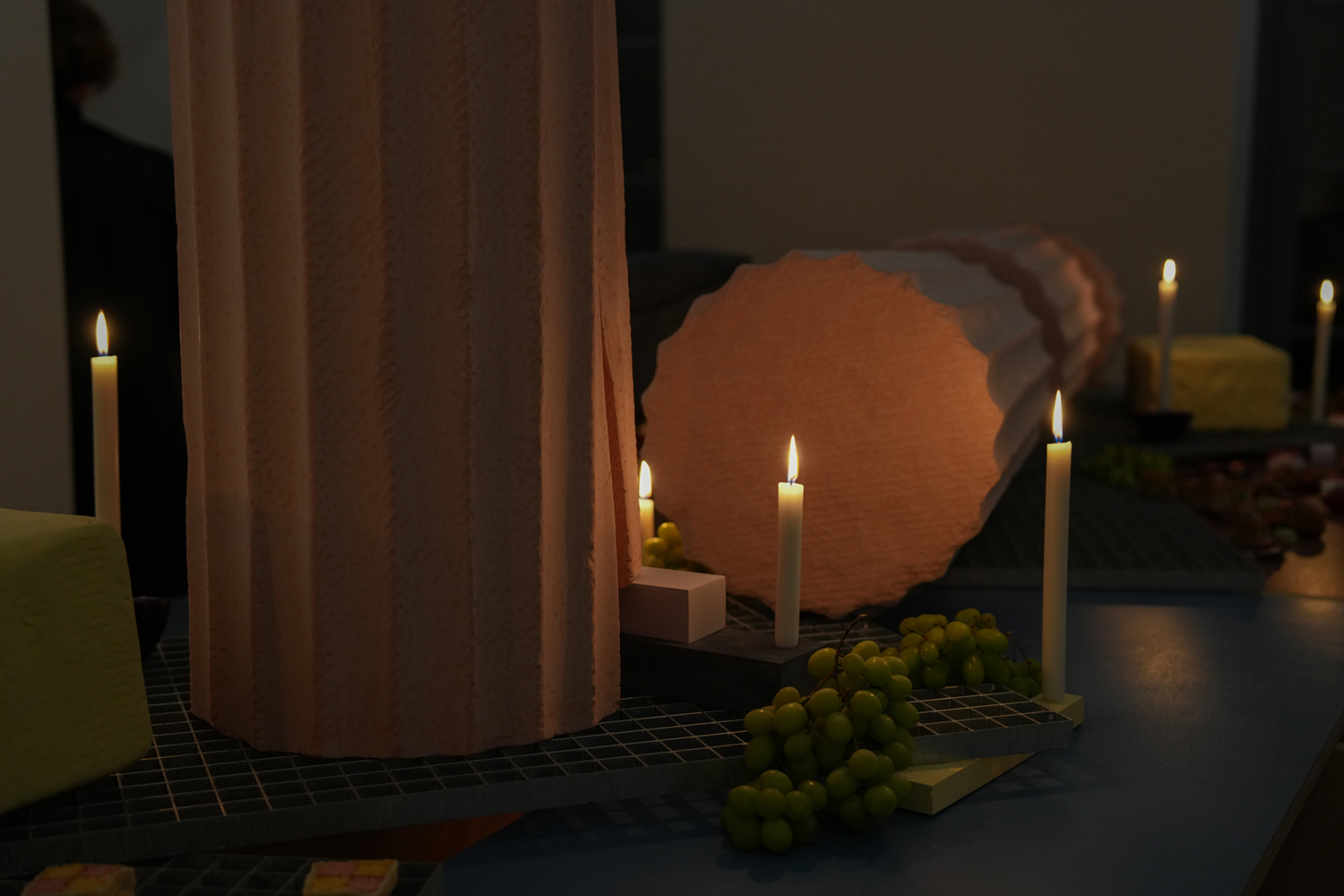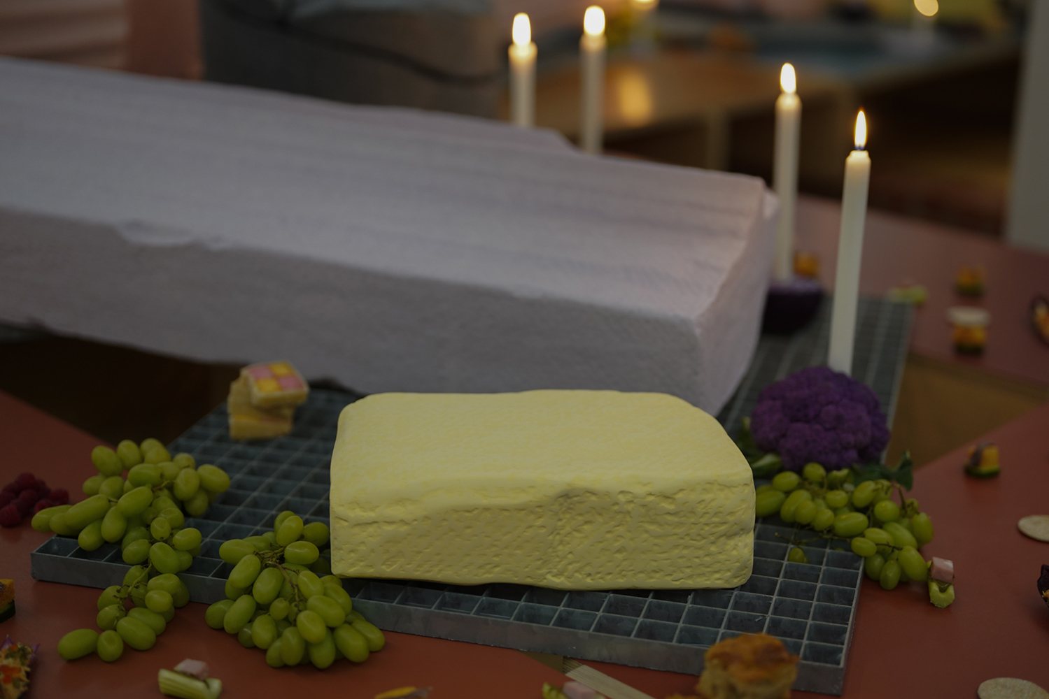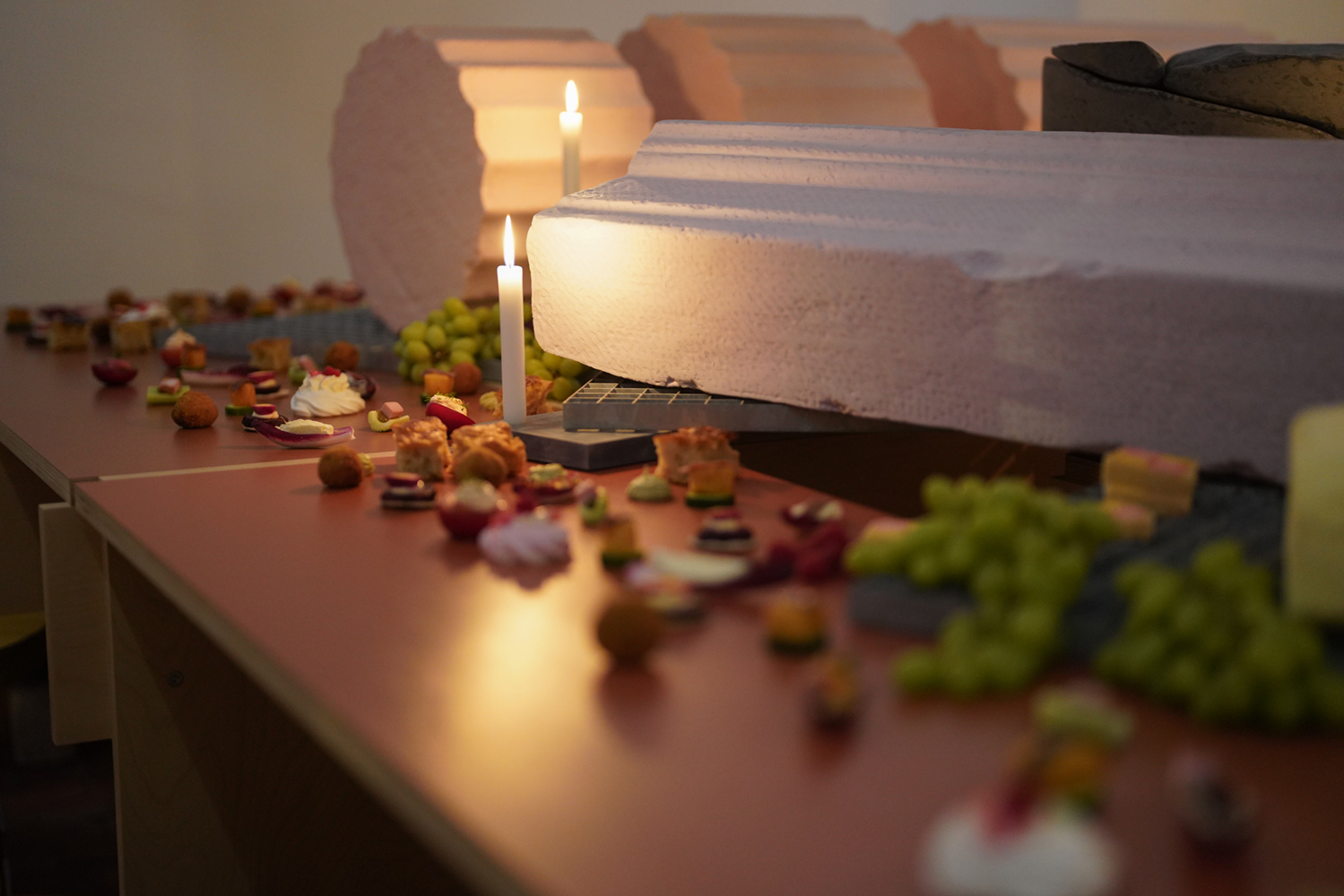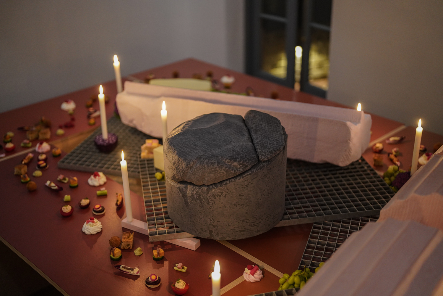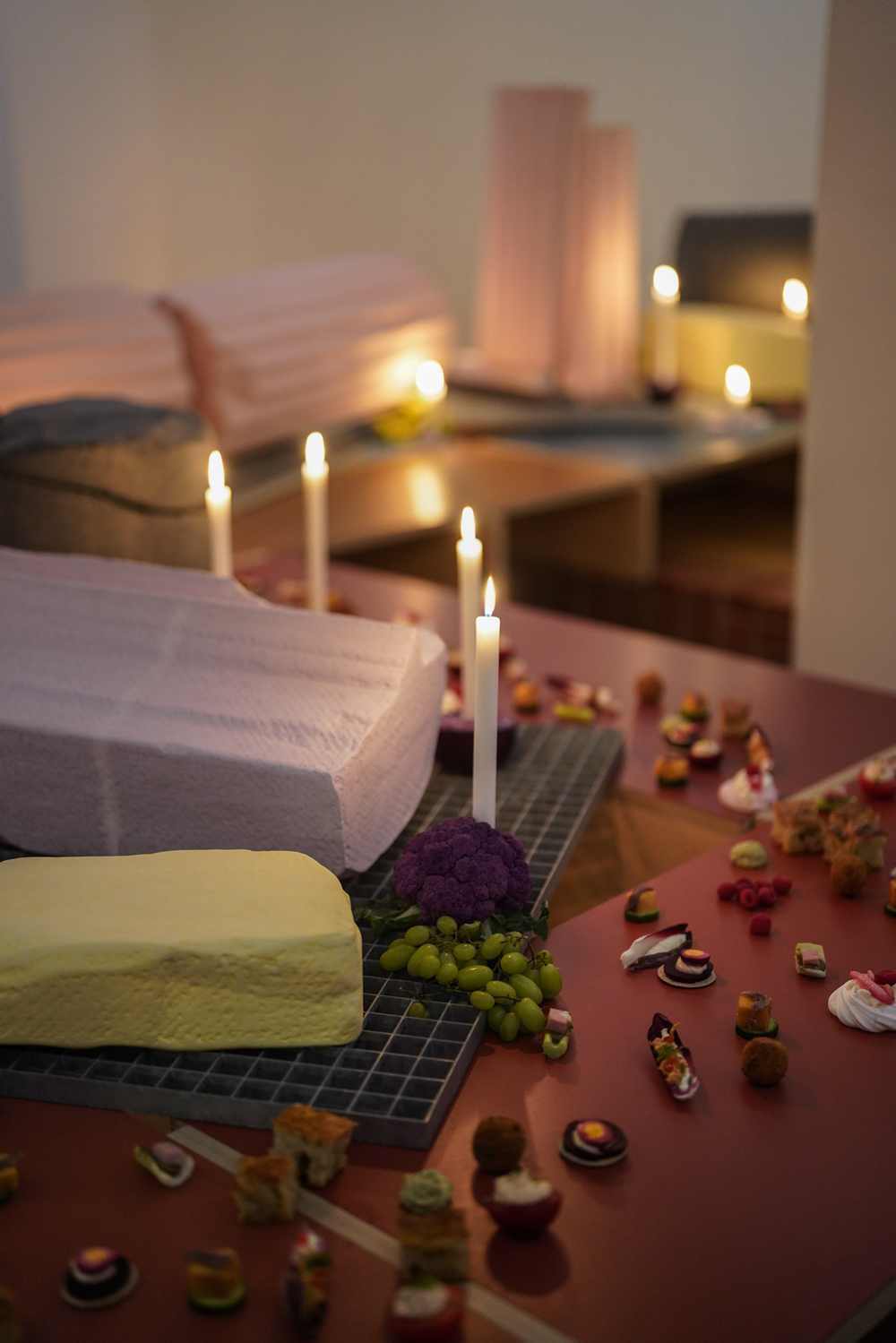 Food was made by artist Francesca Anfossi, its placement on the table drawing inspiration from Heraclitus’ Unswept Floor mosaic.
